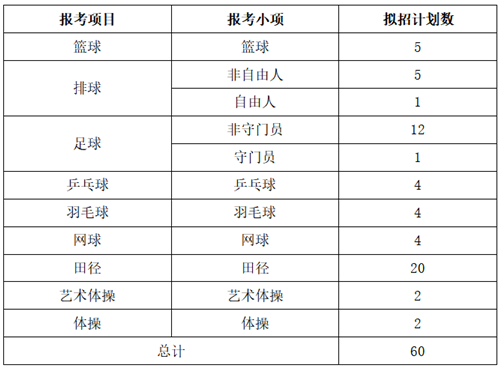 (六)招生计划总数:运动训练(全日制四年本科非师范专业)拟招60人,面向全国招生。