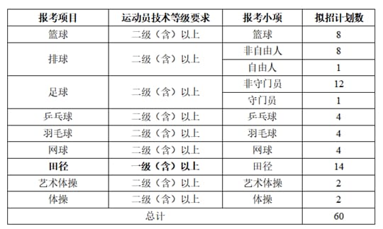 我校2024年运动训练专业面向全国招60人,分项目拟招生计划和运动员技术等级要求如下。